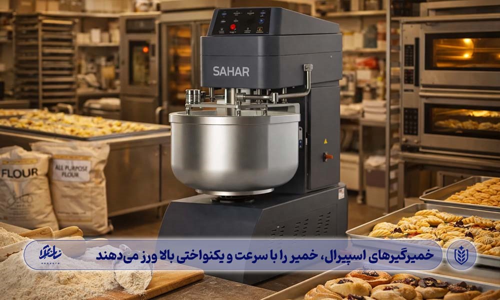 خمیرگیر اسپیرال با طراحی مارپیچی خاص، امکان مخلوط شدن یکنواخت مواد و شکلگیری بهتر بافت خمیر را فراهم میکند. این دستگاه به گونهای طراحی شده است که بدون افزایش بیشازحد دمای خمیر، فرآیند ورز دادن را با سرعت بالا انجام دهد. در این مقاله بررسی میکنیم که خمیرگیر اسپیرال چیست، چگونه کار میکند و چه مزایا و کاربردهایی دارد.
